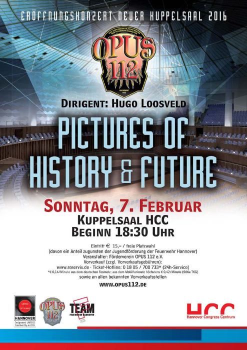 Mit dem Programm "Pictures of History & Future" hat OPUS112 am Sonntag, den 7. Februar 2016 um 18.30 Uhr den komplett renovierten Kuppelsaal des HCC eröffnet.