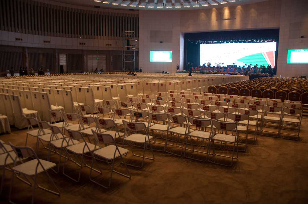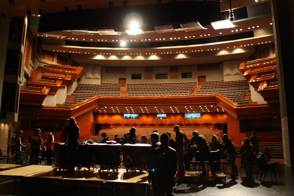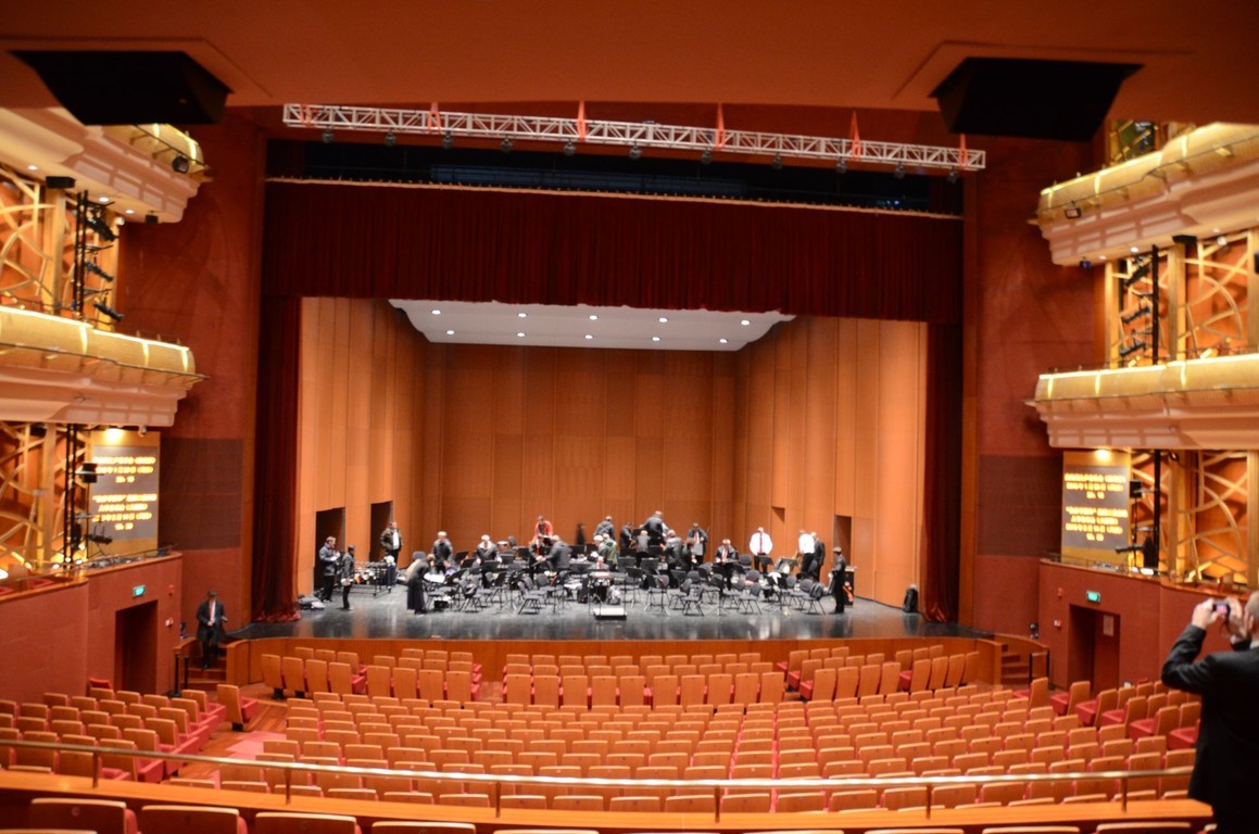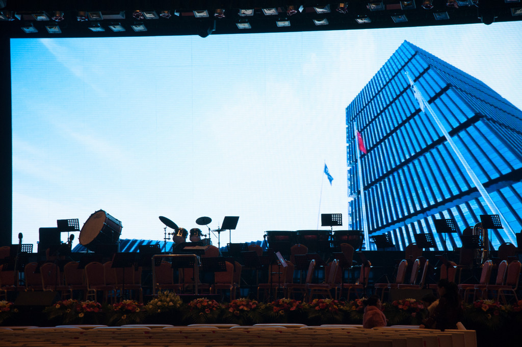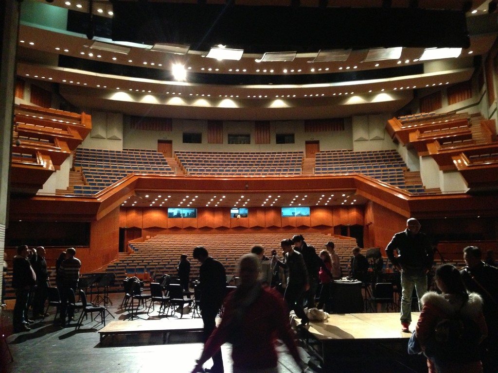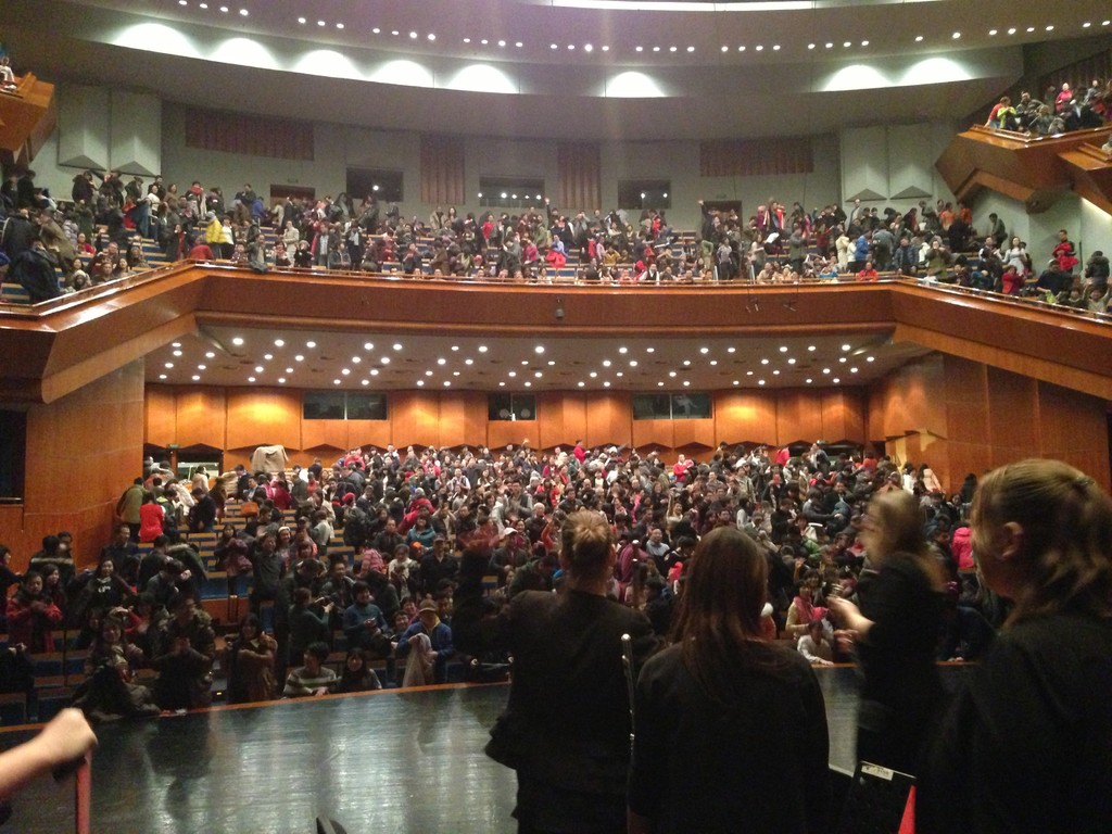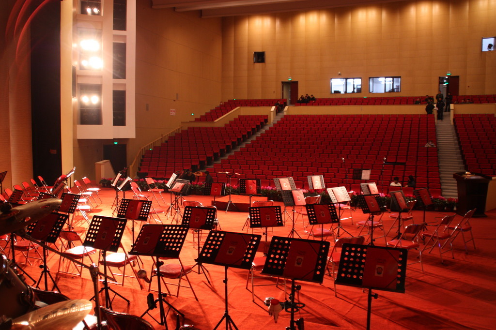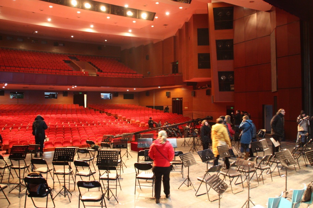 „Außer einer Reizung der Atemwege hat diese Stadt wenig Reizvolles zu bieten.“ Dieser Satz aus dem Reiseführer hat uns die Vorfreude auf Taiyuan, unsere nächste Station, ein wenig gedämpft. Daher fahren wir auch direkt vom Flughafen zum Konzerthaus, um der „Frischluft“ möglichst wenig ausgesetzt zu sein (und weil die Zeit bis zum Konzertbeginn doch etwas knapp wird). Nachdem sich alle in den Backstage-Bereich gequetscht haben, um sich umzuziehen und die Instrumente aufzubauen, kommen wir auf die Bühne. Der Saal ist so groß, dass man die Erdkrümmung erkennen könnte, wenn der Smog hier drinnen nur nicht so dicht wäre.
