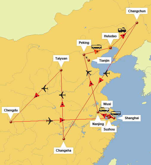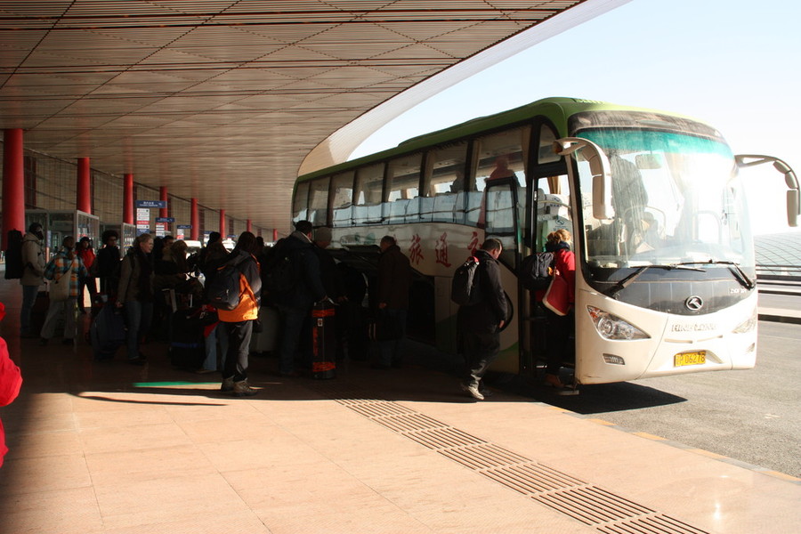 Morgens kommen wir nach langem Flug in China an. Alles hat reibungslos funktioniert, die Flüge waren pünktlich und unsere zwei Gruppen landen mit etwa zehnminütigem Abstand auf dem Flughafen von Peking. Am Gepäckband die Erleichterung: Auch alle Instrumente sind unbeschädigt im Reich der Mitte angekommen. Die chinesischen Organisatoren der Tournee warten schon auf uns. Nachdem jede Gruppe von einem eigenen Bus abgeholt wurde, treffen wir uns in der Beton-Tristesse einer chinesischen Autobahnraststätte zum ersten Mal auf chinesischem Boden wieder. Zum Mittagessen gibt es (doch relativ schmackhafte) Nudeln mit Fleisch aus Styroporboxen. Die Stärkung ist aber auch wirklich nötig: Immer noch kein richtiger Schlaf, und bis zu unserem ersten Hotel in Huludao sind es noch runde sechs Stunden Busfahrt!