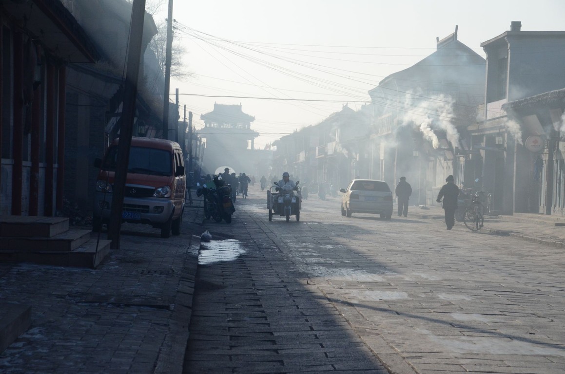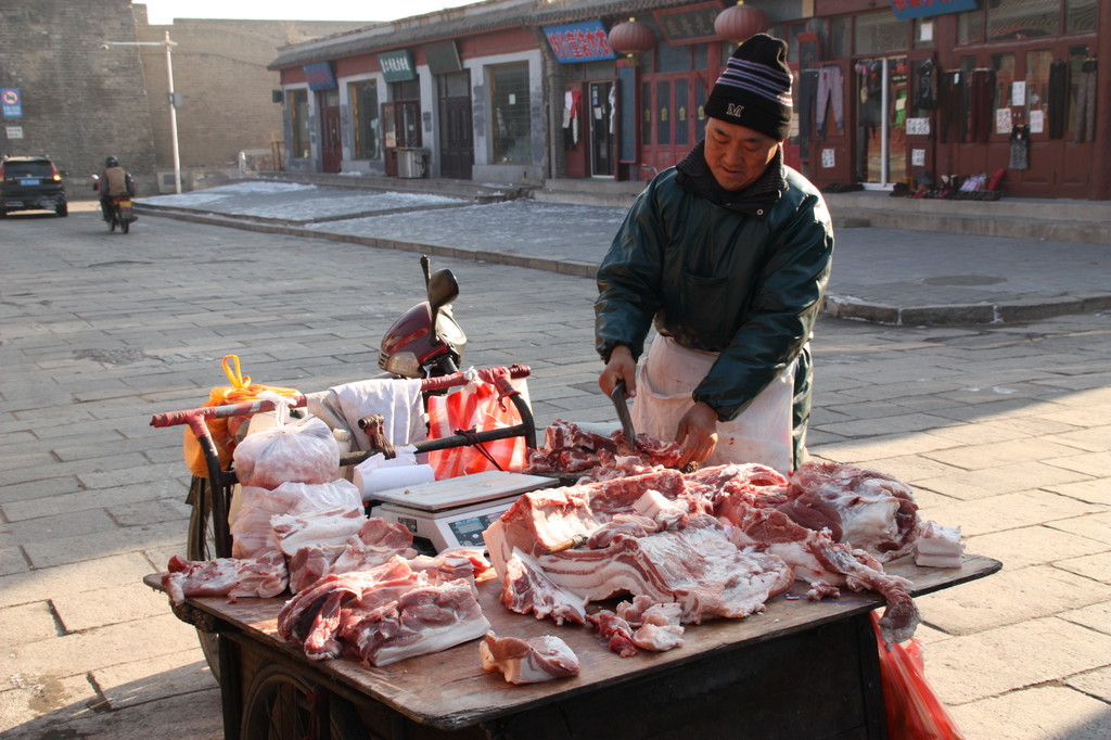 Guten Morgen China! Nach einem ersten chinesischen Frühstück (an die Auswahl mit panierten Hühnerfüßen müssen wir uns erst noch gewöhnen) ist am Vormittag ein Ausflug geplant. Wir besichtigen die alte Ming-Stadt von Xingcheng. Die altehrwürdigen Mauern und die chinesische Architektur sind wirklich beeindruckend. Außerdem können wir uns - dick eingepackt – gleich einmal an die winterliche Eiseskälte Nordchinas gewöhnen. Ein Metzger bietet seine Ware auf offener Straße feil. Die Kühlkette unterbricht er damit jedenfalls nicht. Die Motorroller, die um uns herum wuseln, haben eingebaute Handschuhe am Lenker. Um diese Jahreszeit scheinen wir die einzigen Touristen hier zu sein….