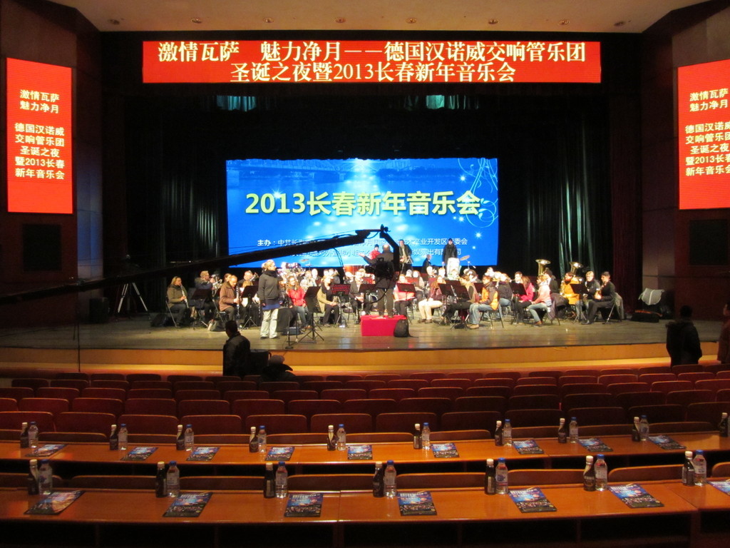 Es geht weiter nach Norden! Morgens reisen wir mit dem Hochgeschwindigkeitszug die rund 550 Kilometer von Huludao in die Millionenstadt Changchun. Mittagessen bei 190 km/h. Es wird von Kilometer zu Kilometer kälter. Ankunft am frühen Nachmittag bei -18°C. Etwa selbige Temperatur erwartet uns dann am Abend auch auf der Bühne des Konzertsaals, wo wir wie jeden Abend eine kurze Einspiel- und Akustikprobe abhalten möchten. Die Bühnentechniker waren wohl bis zur letzten Minute mit dem Aufbau beschäftigt und haben die Tore der Laderampen hinter der Bühne sehr lange aufgelassen. Es ist wirklich nicht einfach, hier Musik zu machen, da unseren Blechbläsern die Ventile und Züge buchstäblich festfrieren(!) und die Holzbläser Angst um die Unversehrtheit ihrer Instrumente haben müssen (Holz kann reißen und ist dann kaum noch reparabel). Zum Konzert hat sich die Lage dann aber merklich gebessert und wir können trotz allem ein schönes Konzert geben. Erneut ist der Saal mit fast 2.000 chinesischen Zuhörern ausverkauft, und der lokale Fernsehsender zeichnet zusätzlich unser Konzert mit diversen Kameras auf. Nach dem Konzert dürfen wir Autogramme schreiben und uns für Erinnerungsfotos zur Verfügung stellen. Erste Zweifel kommen auf, ob uns das alles zu Hause überhaupt jemand glaubt! ;)